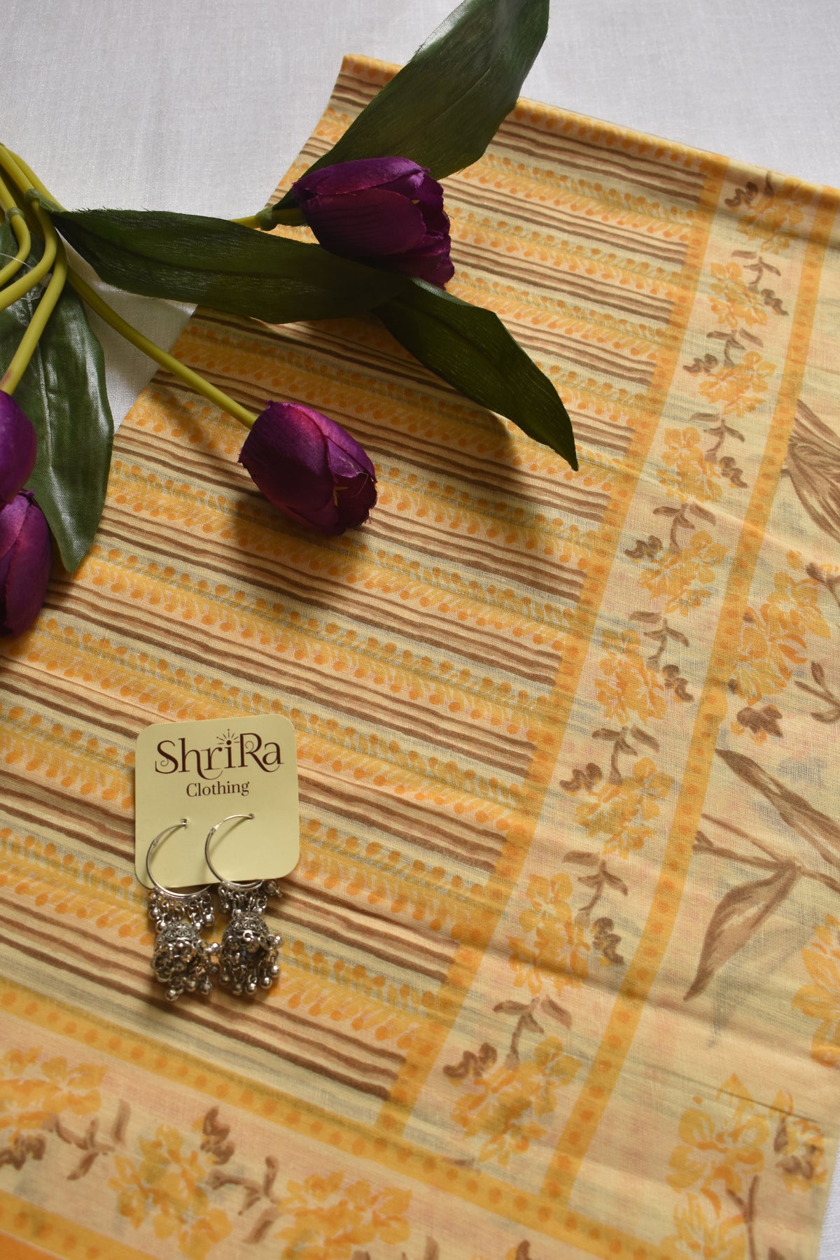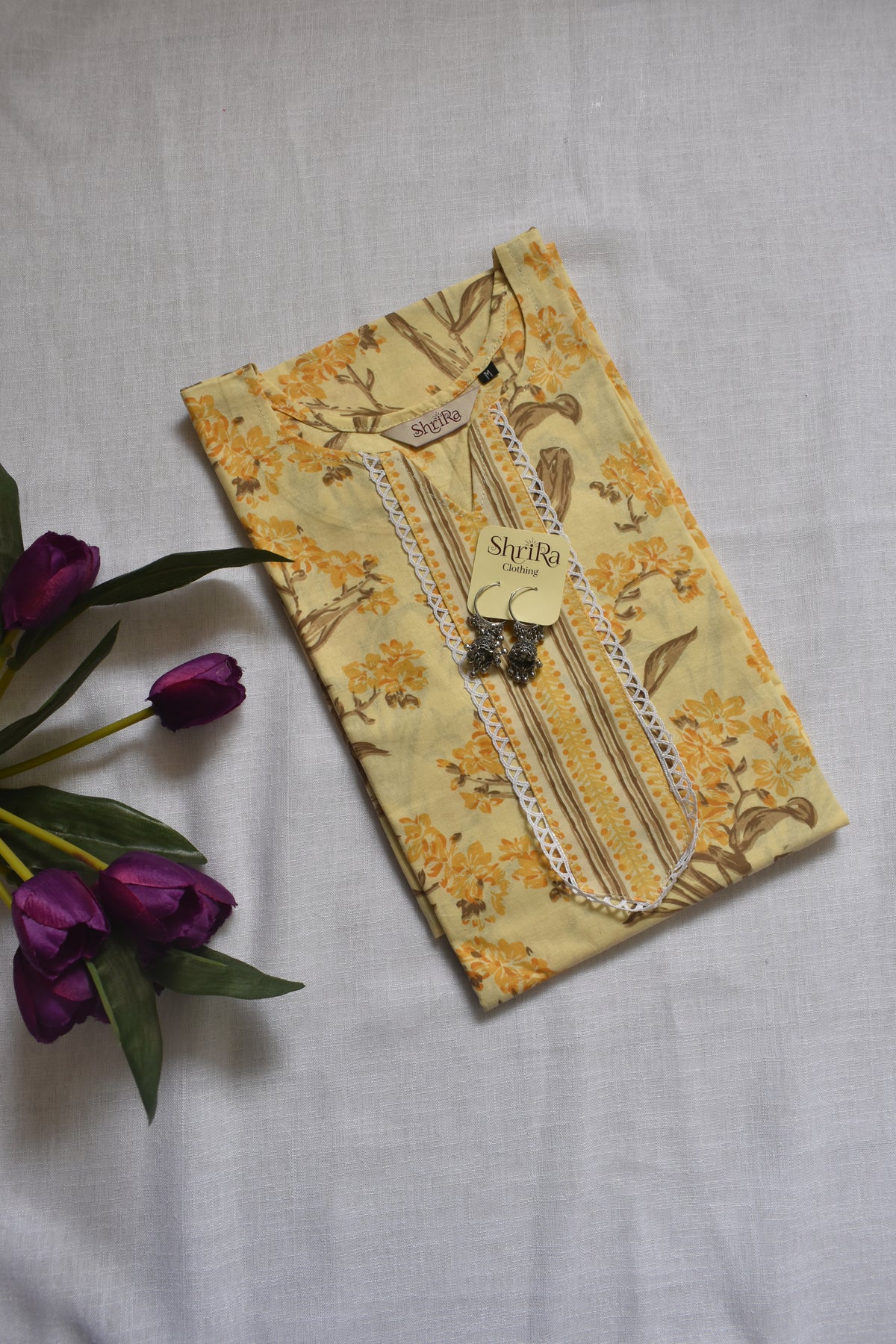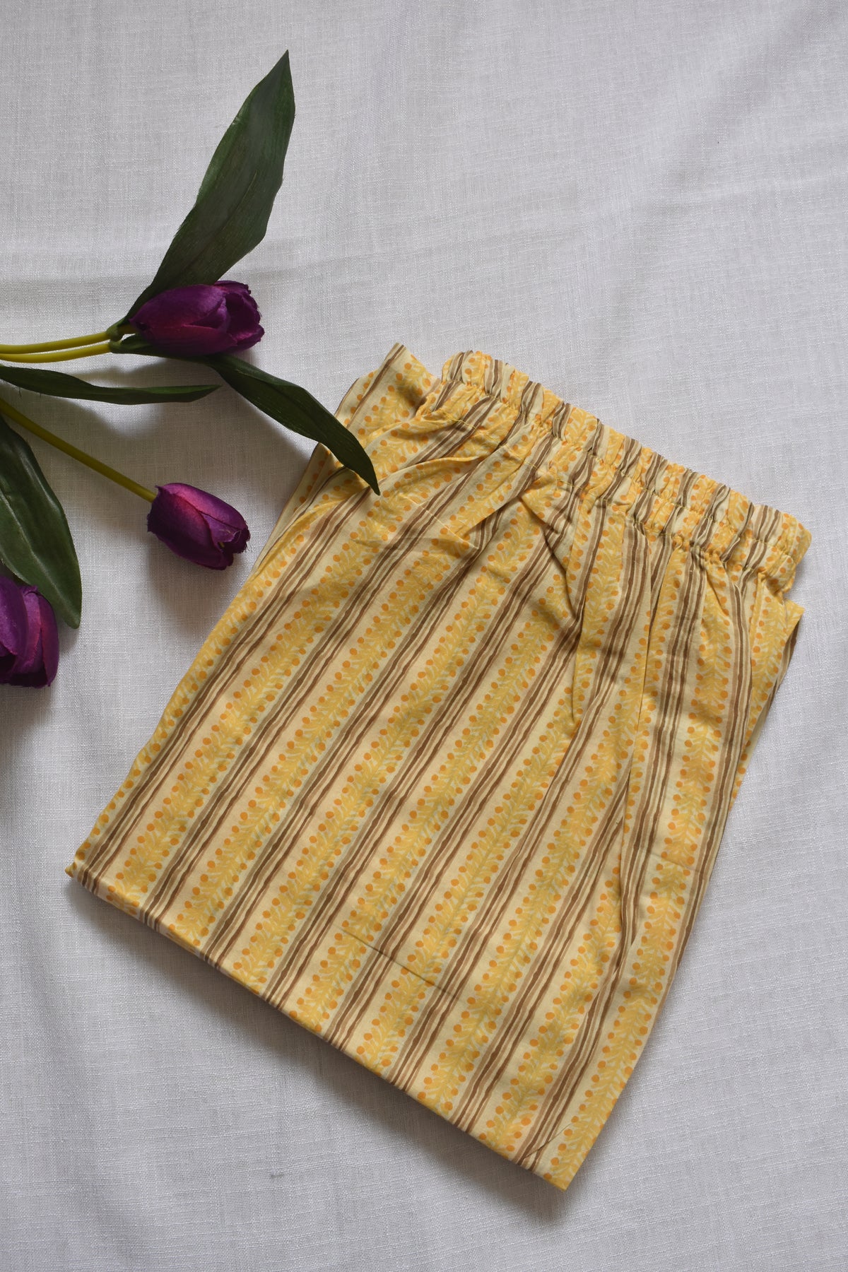 Radiating the warmth of golden blooms, the Chandanika Dress is a graceful blend of tradition and modern ease. ' The dress is designed for effortless comfort – paired with striped cotton pants that echo the same earthy tones, creating a harmonious and versatile look. Whether for festive gatherings, serene pujas, or everyday elegance, Chandanika carries the charm of timeless Indian femininity.