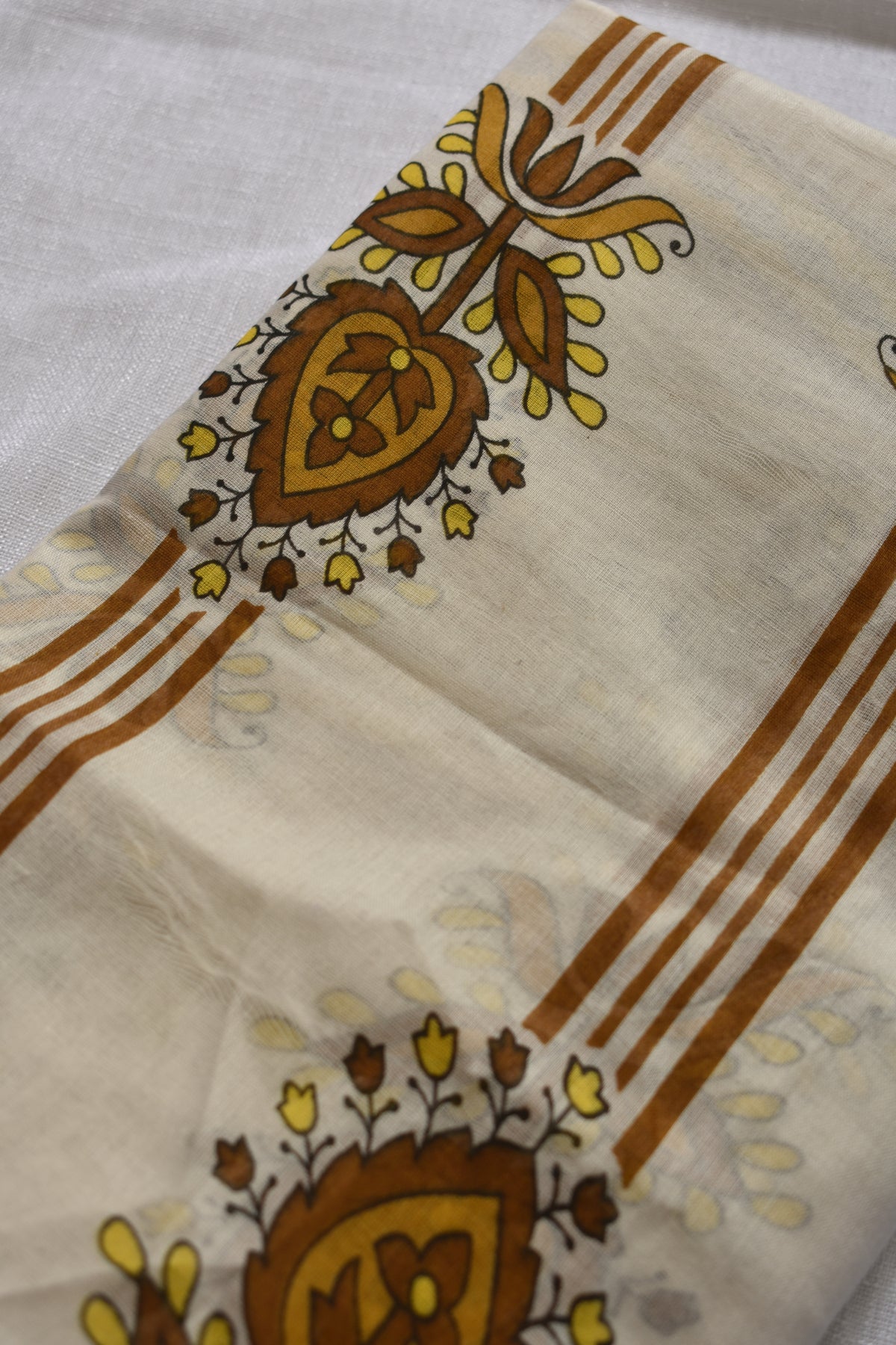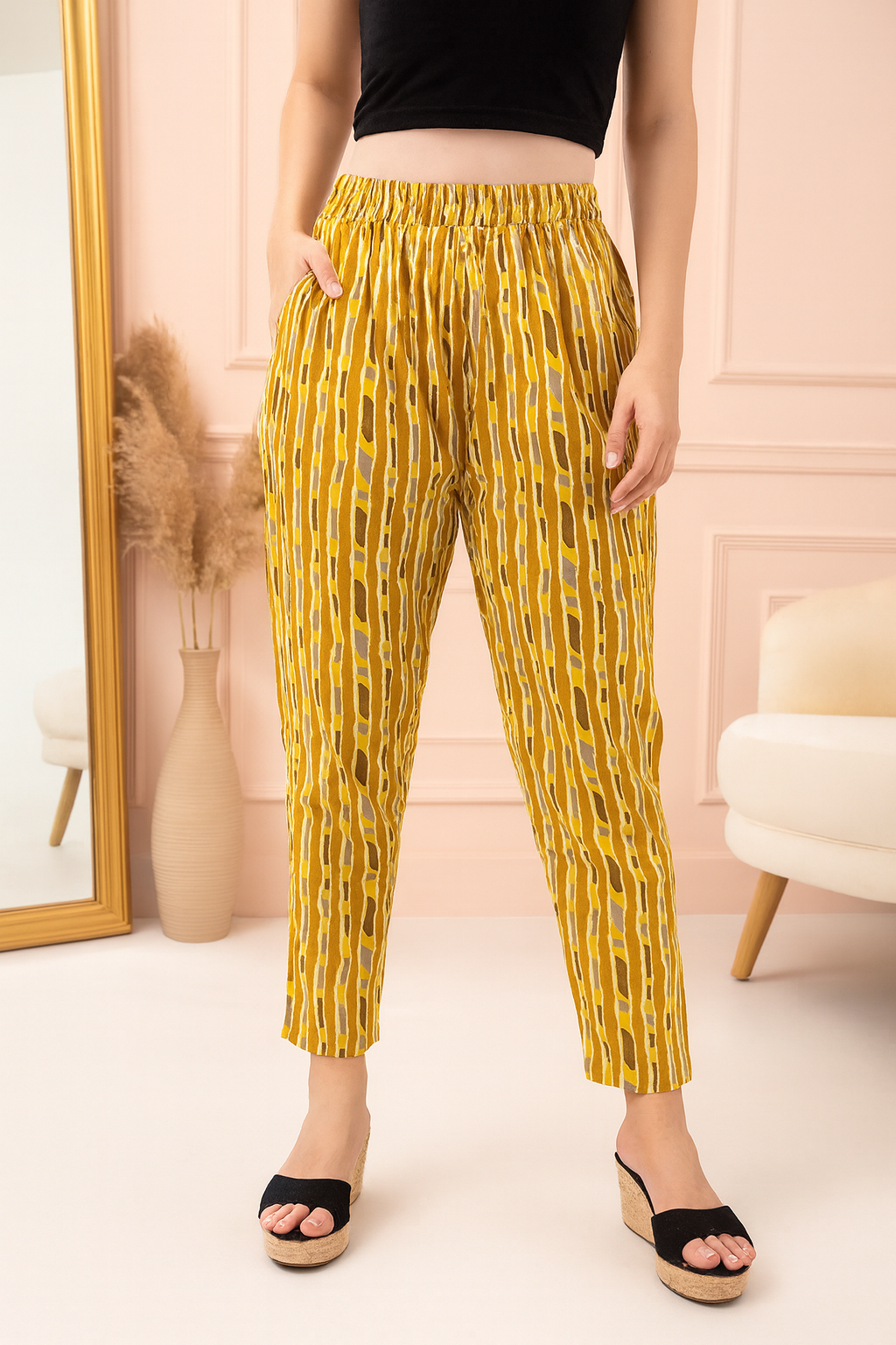Crafted in a rich mustard hue, the kurta features delicate hand-block inspired floral motifs that celebrate timeless Indian artistry. The V-neckline is enhanced with mirror lace detailing and a striped inner lining that adds a subtle festive charm. Paired with coordinated striped pants, this set beautifully balances floral grace with contemporary comfort.