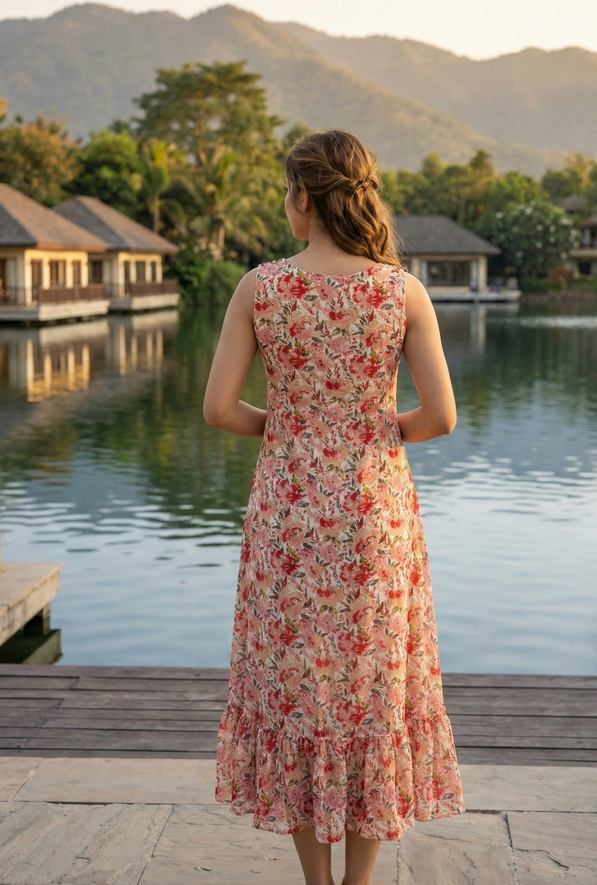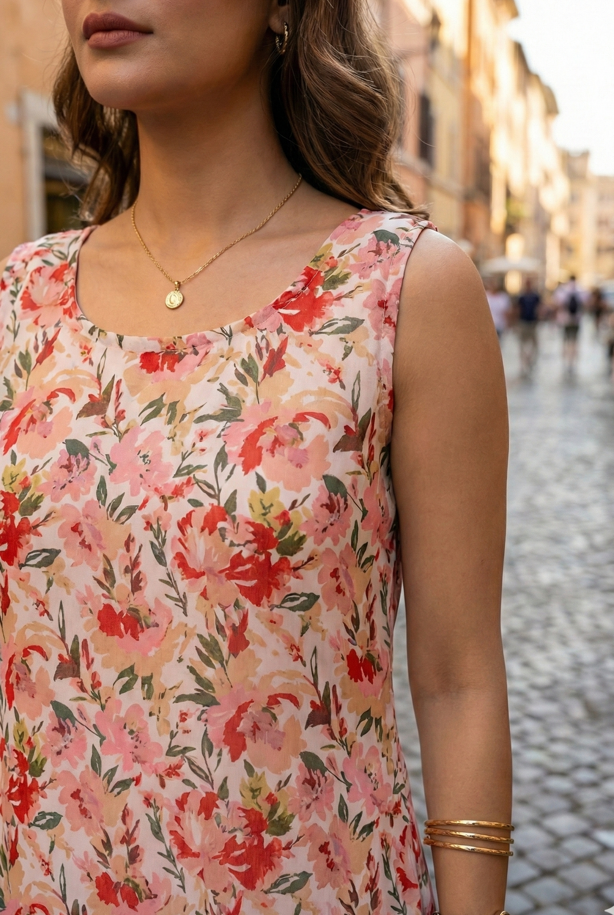 This sleeveless beauty features a lively mix of Red and beige florals with a flared hem for that perfect flow. Lightweight and breathable, it’s your ideal pick for sunny strolls, brunch dates, or easygoing weekends.