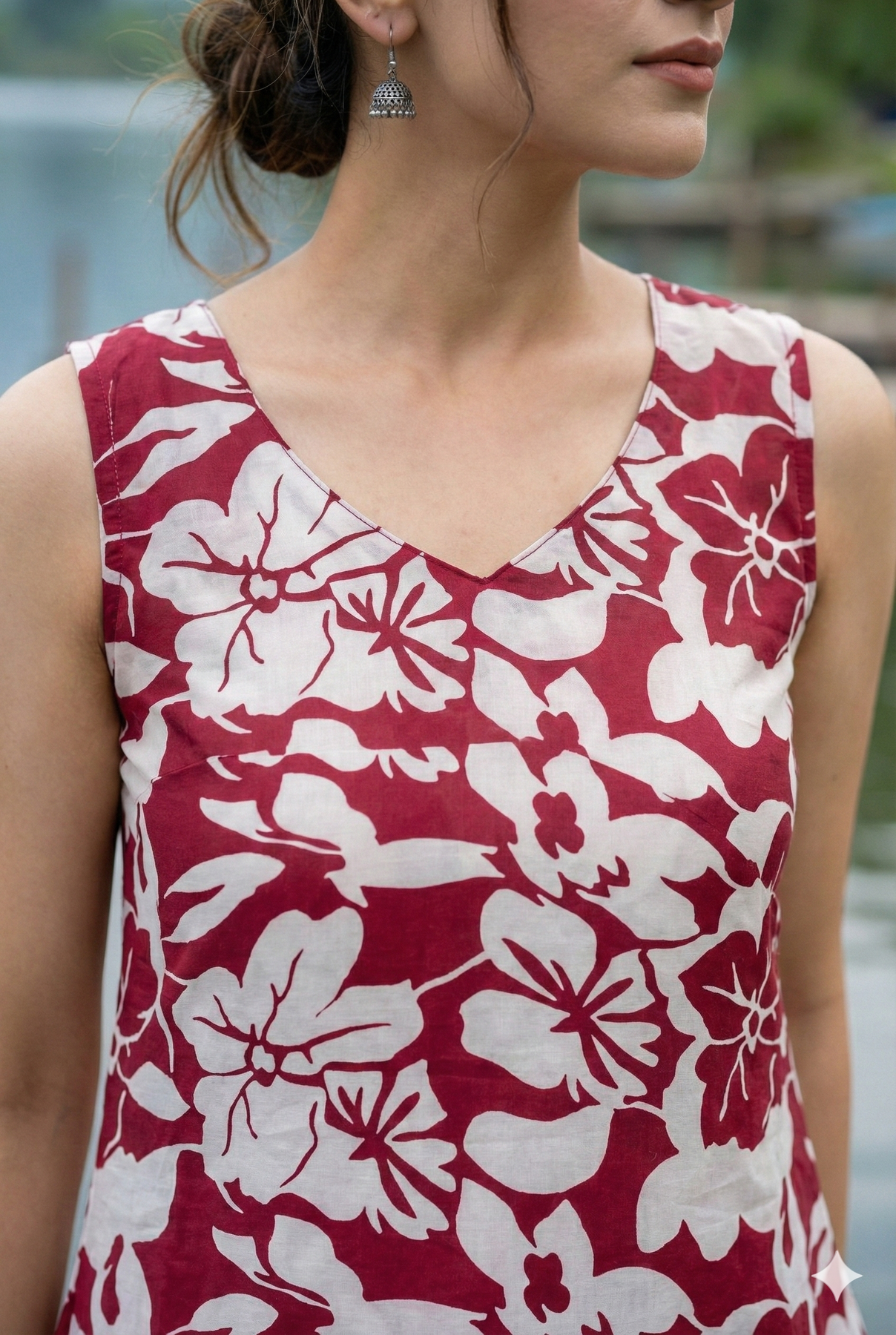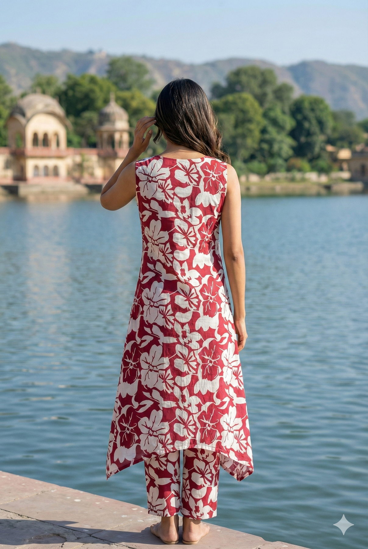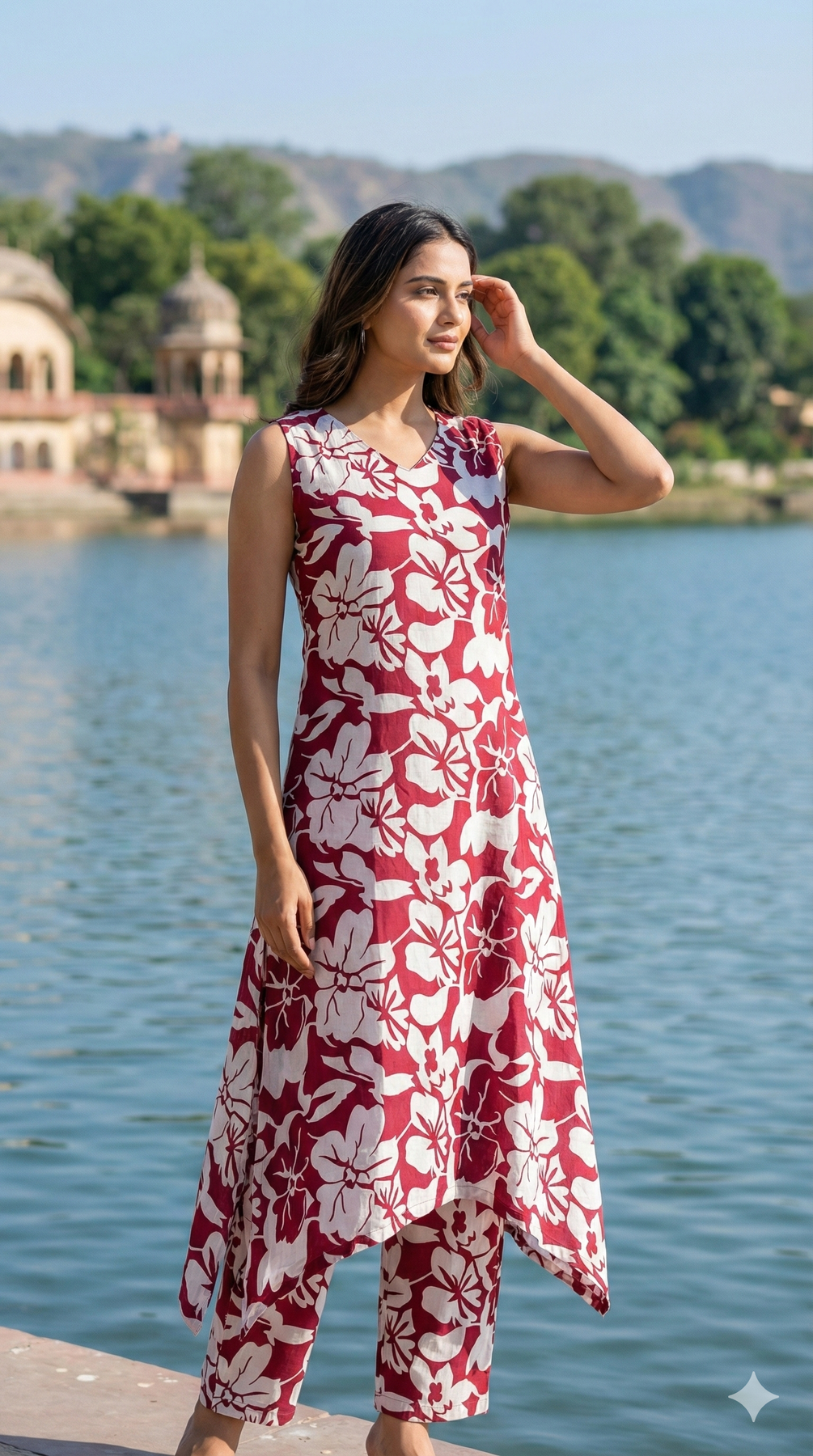Step into effortless elegance with our Crimson Flora Cotton Co-ord Set. Crafted from soft, breathable cotton, this sleeveless ensemble features a vibrant maroon base adorned with bold ivory floral motifs. The asymmetrical hemline adds a modern twist to its ethnic charm, while the matching straight-fit pants ensure comfort and ease all day long.