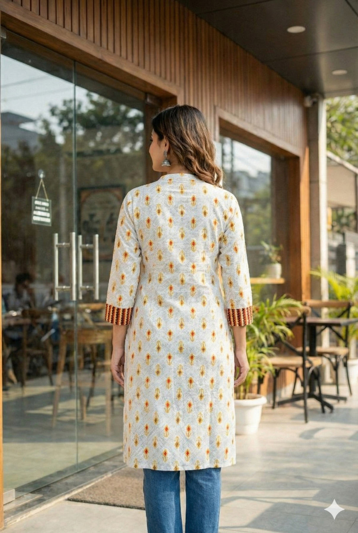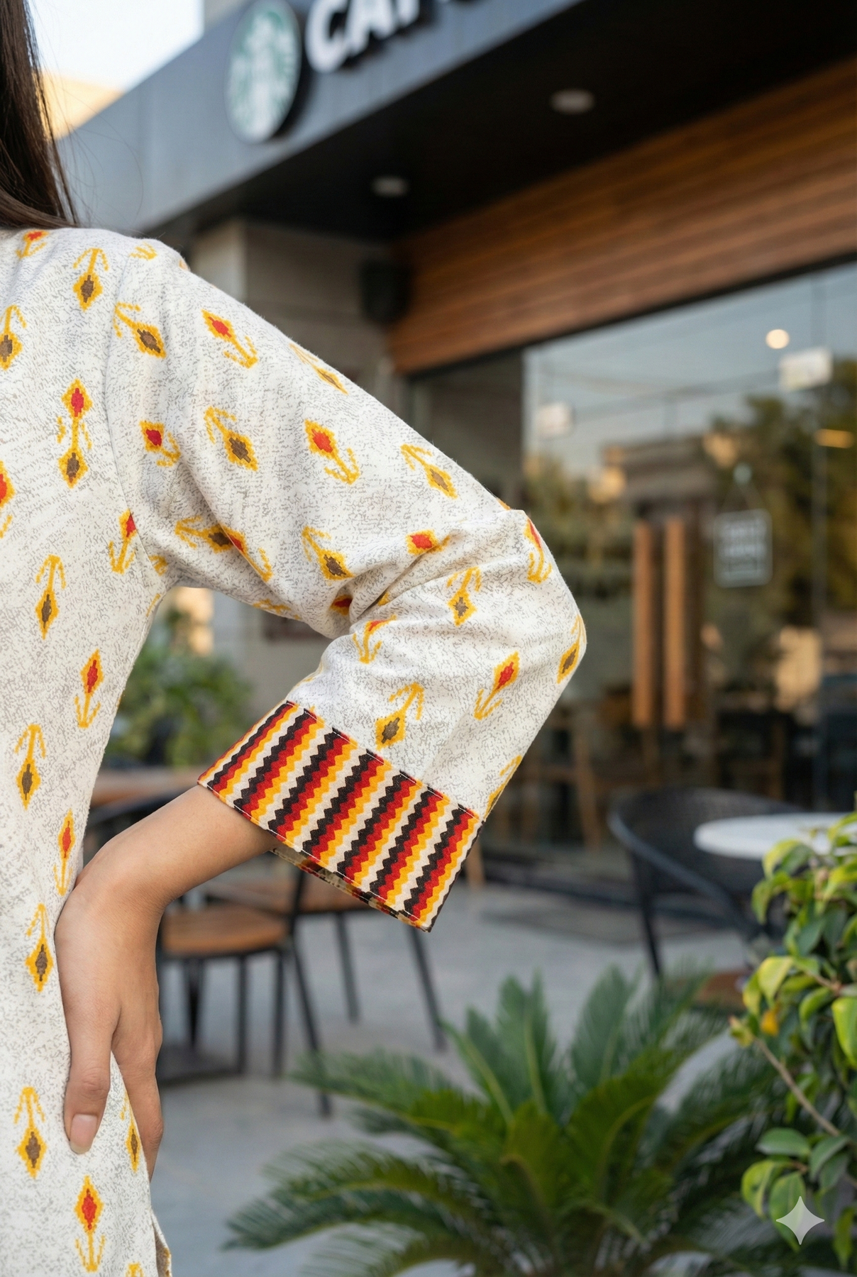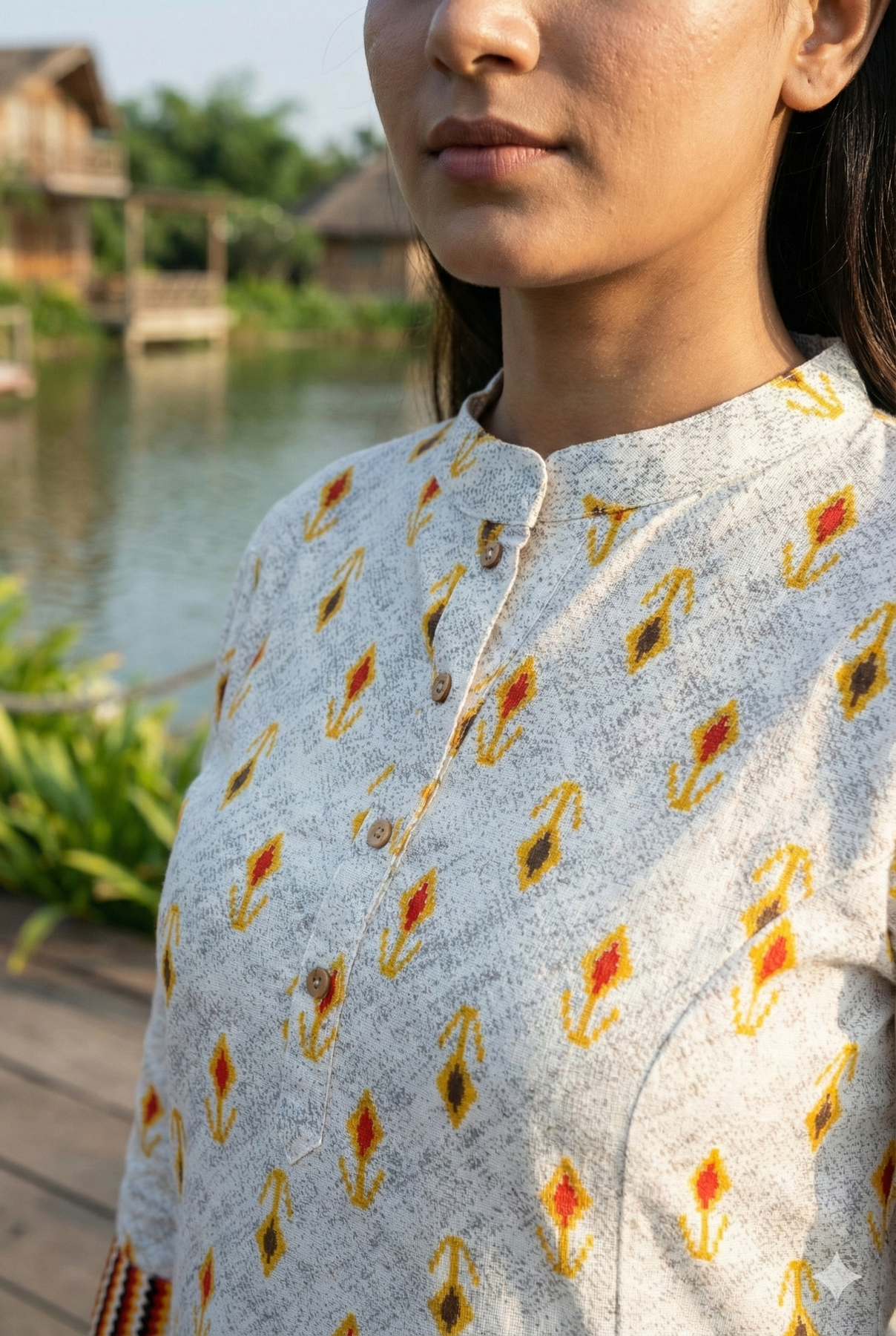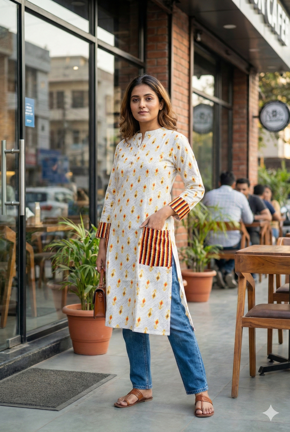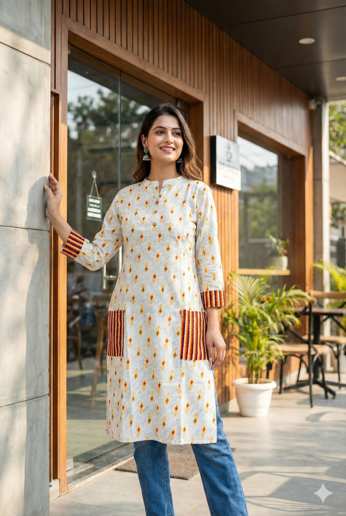 Brighten up your day with Flame Petal Kurta — a lively printed dress featuring golden-yellow floral motifs and bold striped patch pockets. A fusion of comfort and color that brings everyday dressing to life.