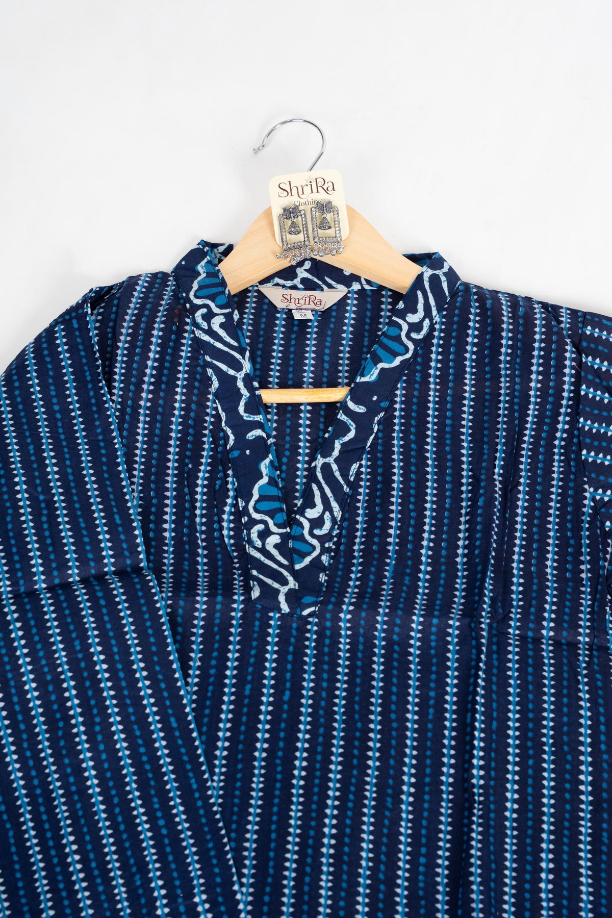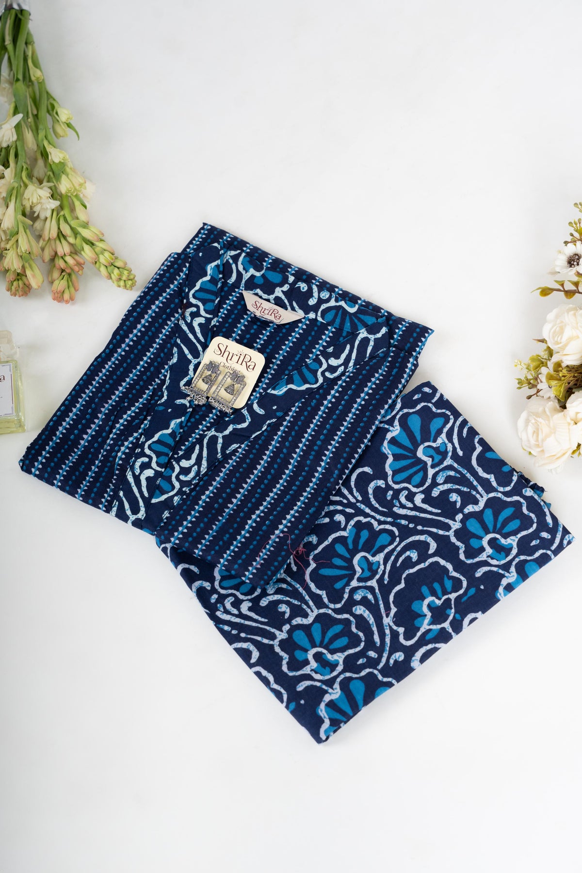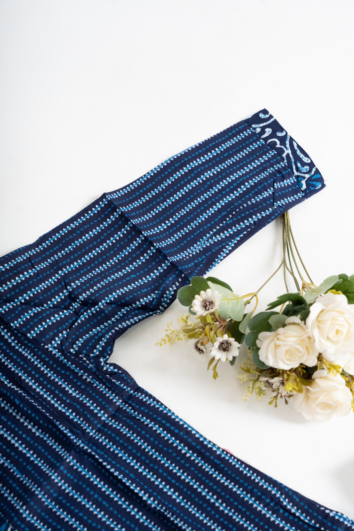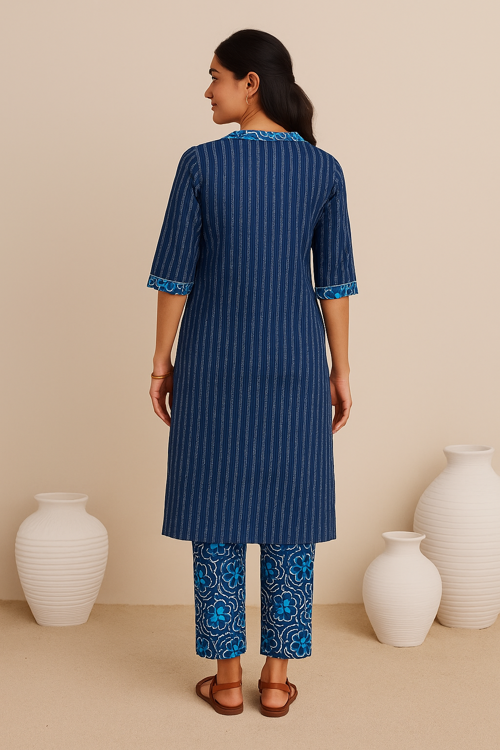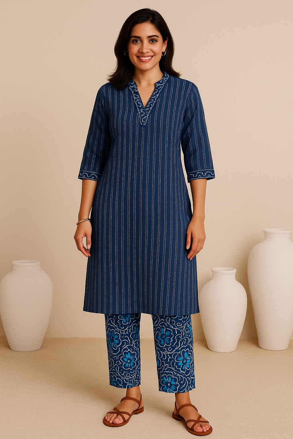 Step into effortless elegance with Indigo Rhythm – a soothing indigo kurta set featuring dotted vertical stripes and a contrast floral bottom. Comfortable, classy, and made for easy everyday grace.
