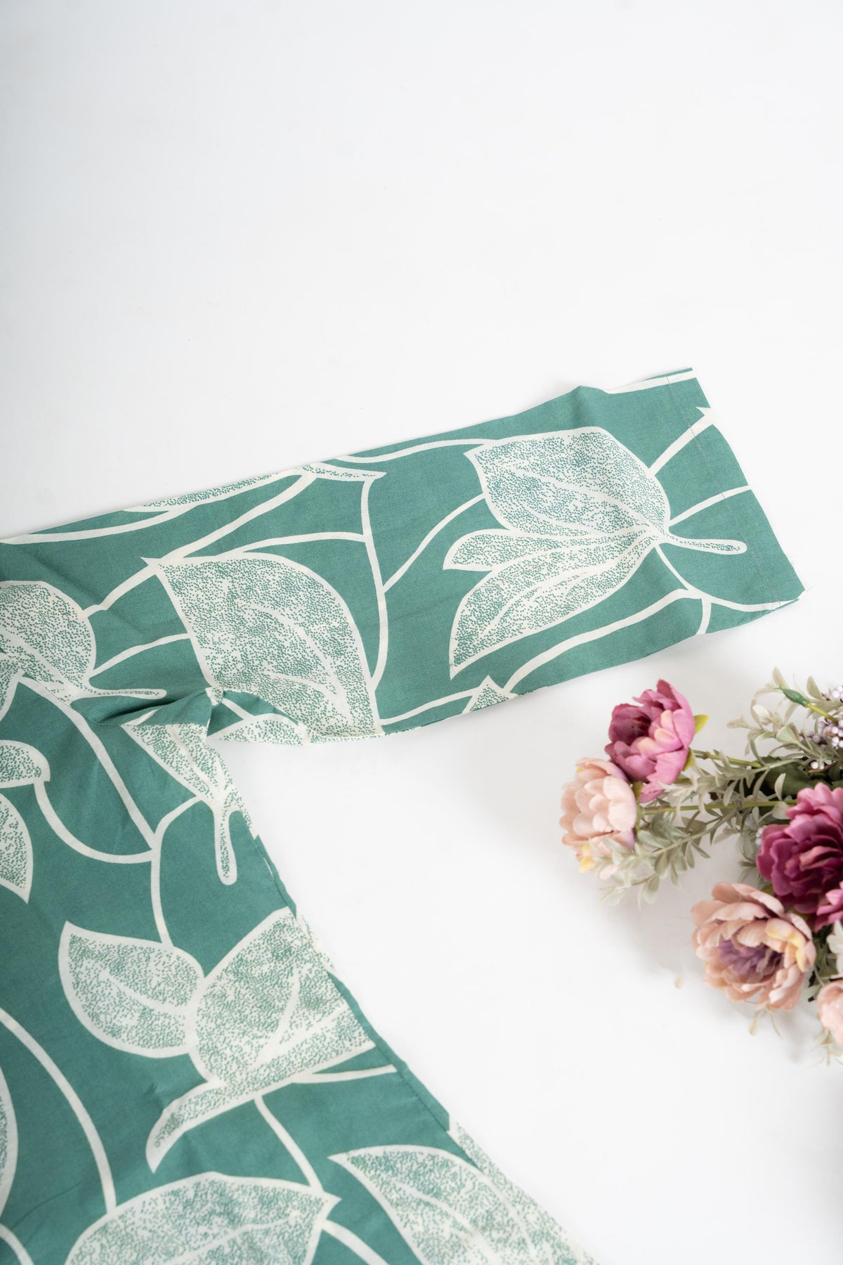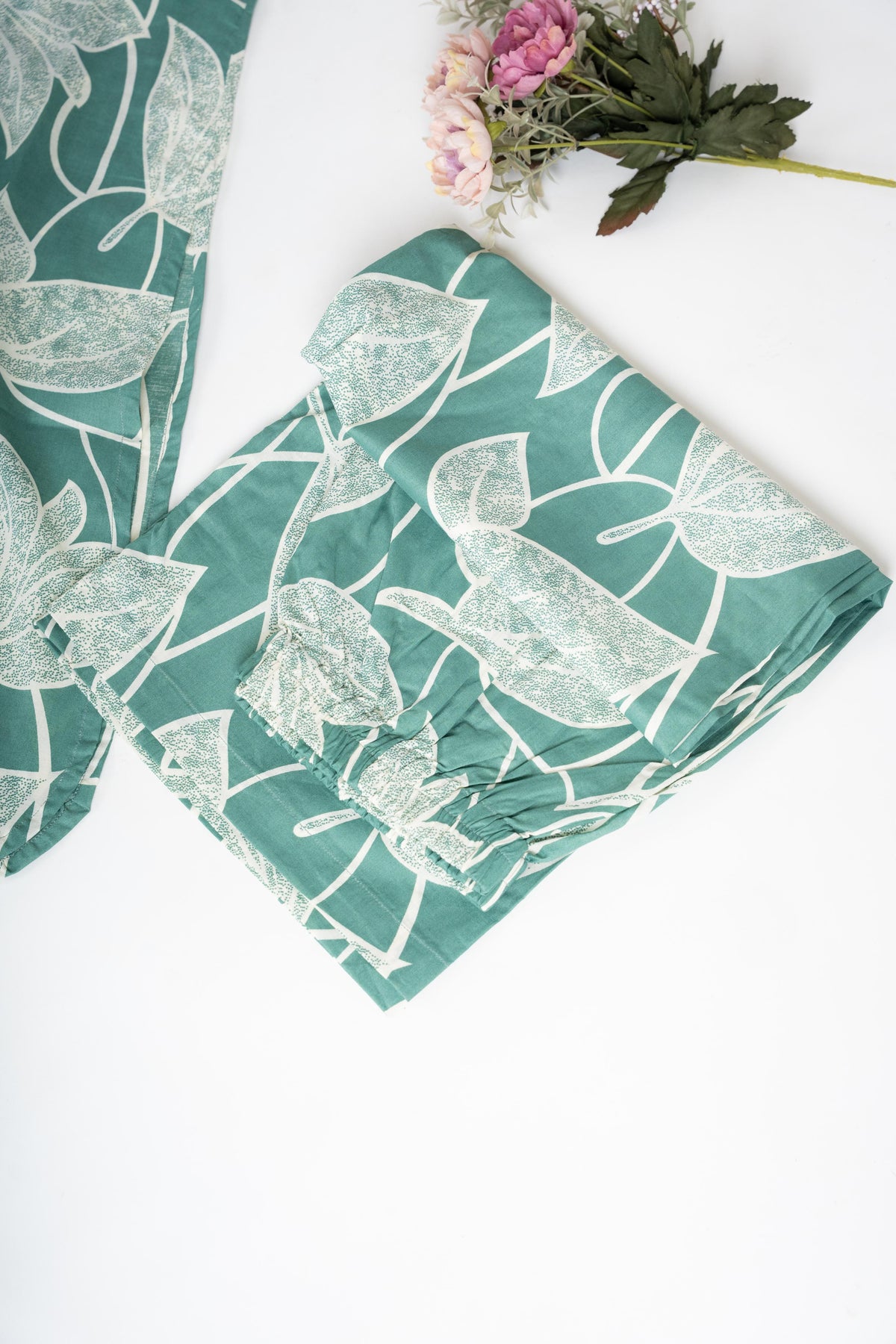 Made from soft, breathable cotton, this two-piece set features a calming sage green hue with delicate leaf motifs. Perfect for lounging or a relaxed day at home, it combines comfort with a fresh, nature-inspired look.