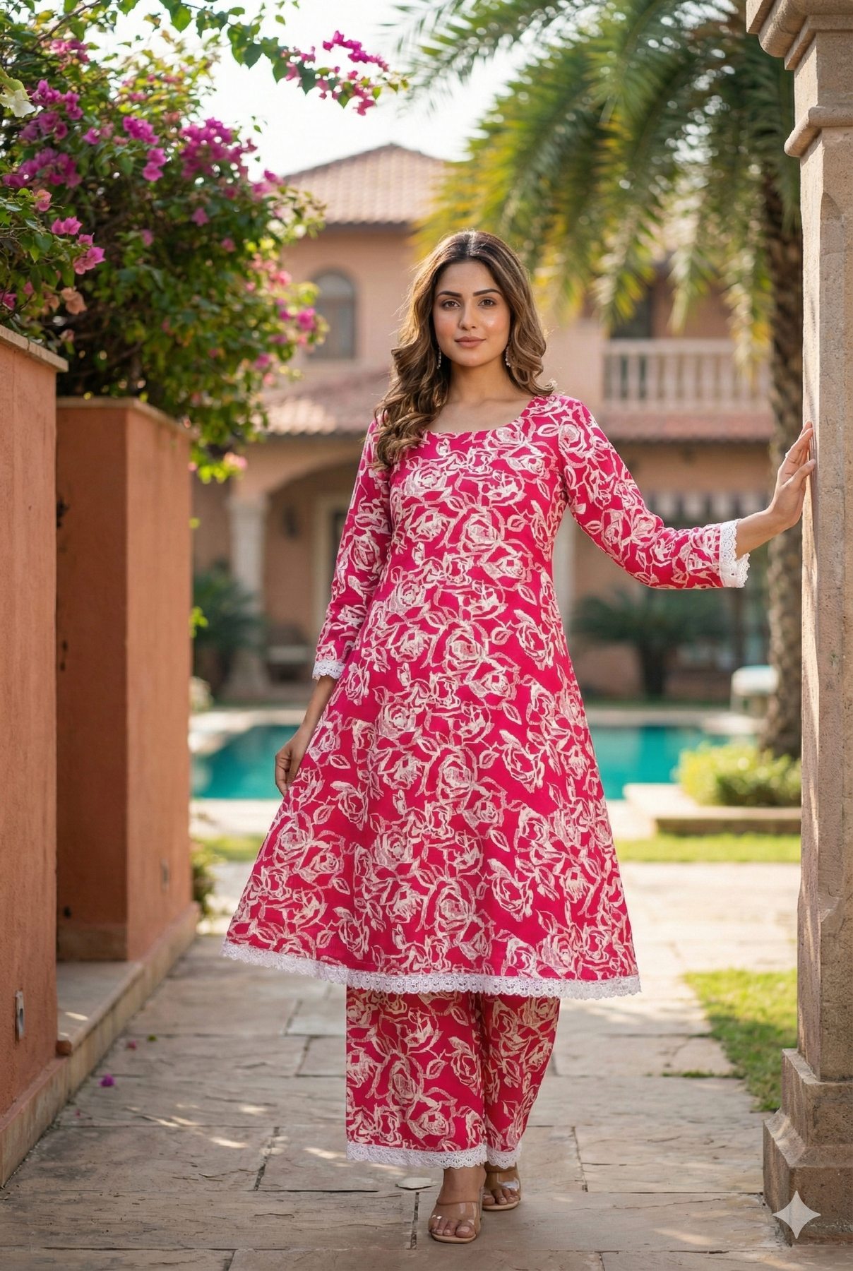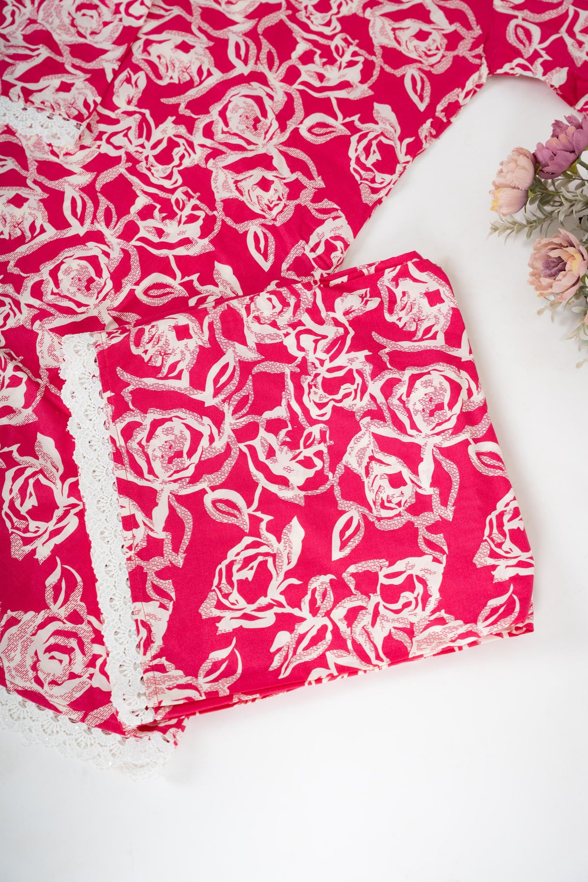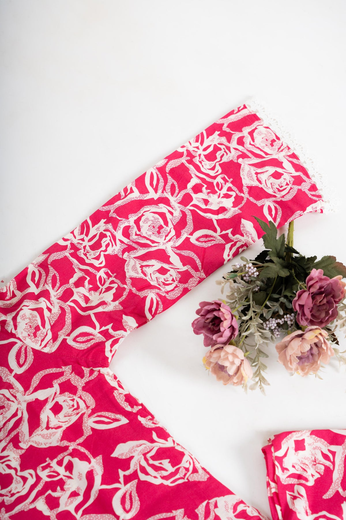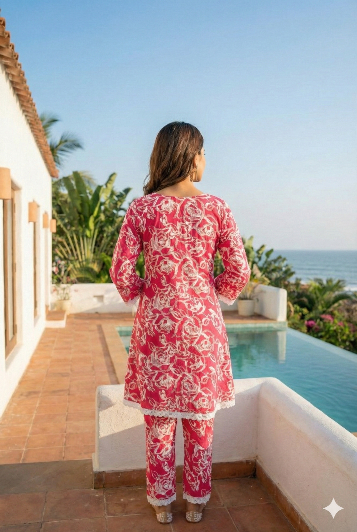 Crafted in soft cotton and blooming with delicate rose prints, this two-piece outfit features charming lace details for a feminine touch. Ideal for relaxed evenings or cozy mornings, it's comfort wrapped in floral grace.