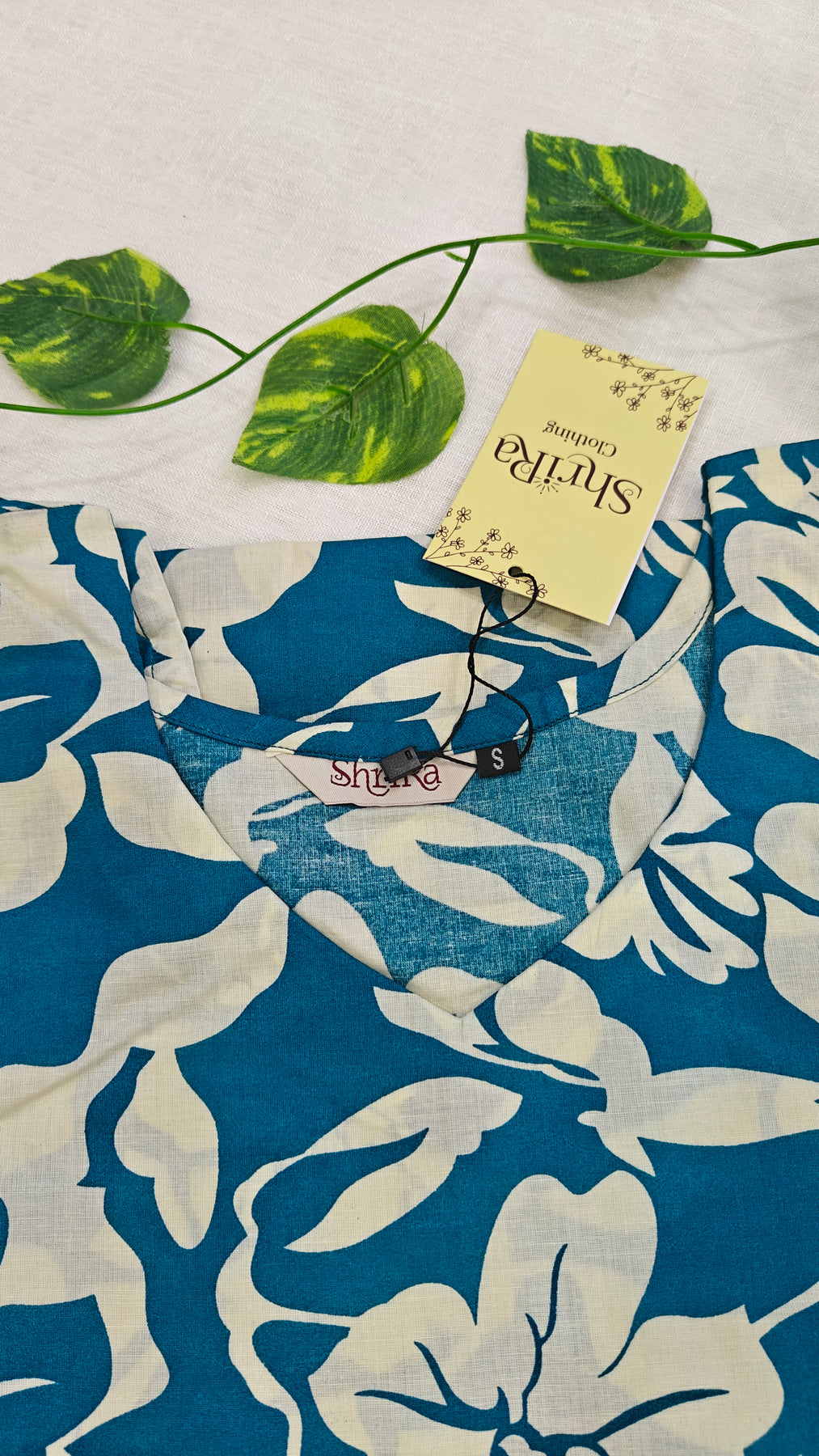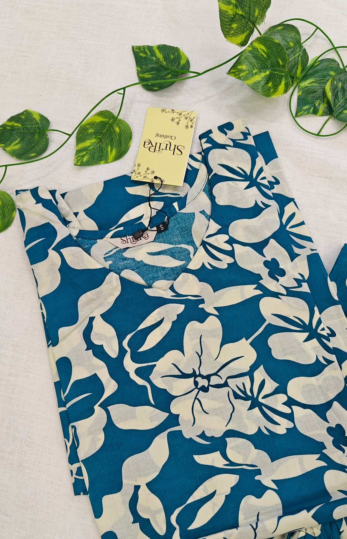 Embrace effortless elegance with our Teal Petal Harmony Co-ord Set, crafted in soft, breathable cotton. The soothing teal base is adorned with bold ivory floral prints, bringing a refreshing tropical charm to your everyday style. The sleeveless V-neck kurta features an asymmetric hemline for a contemporary touch, paired with matching straight-fit pants for all-day comfort. Perfect for brunches, casual outings, or relaxed festive gatherings — this set blends ease with timeless grace.