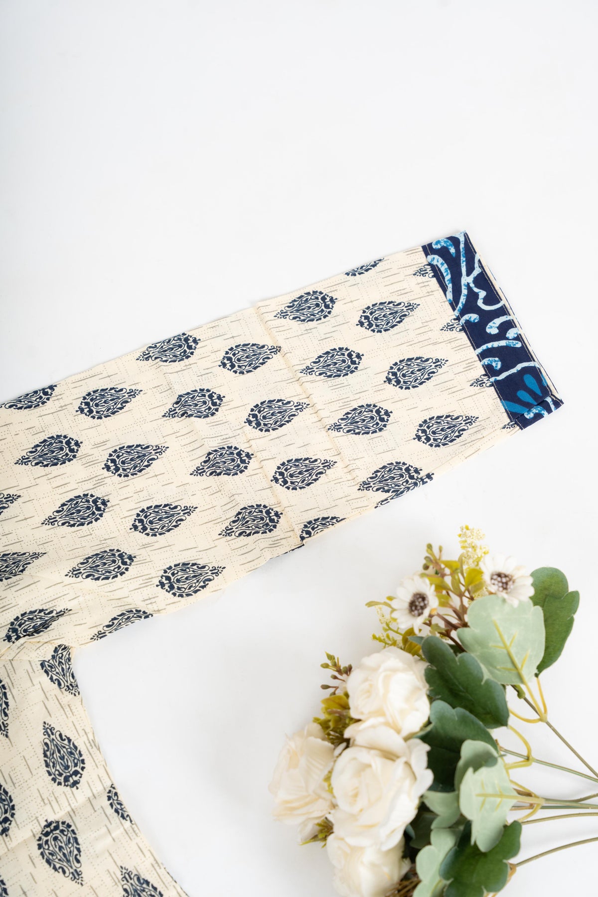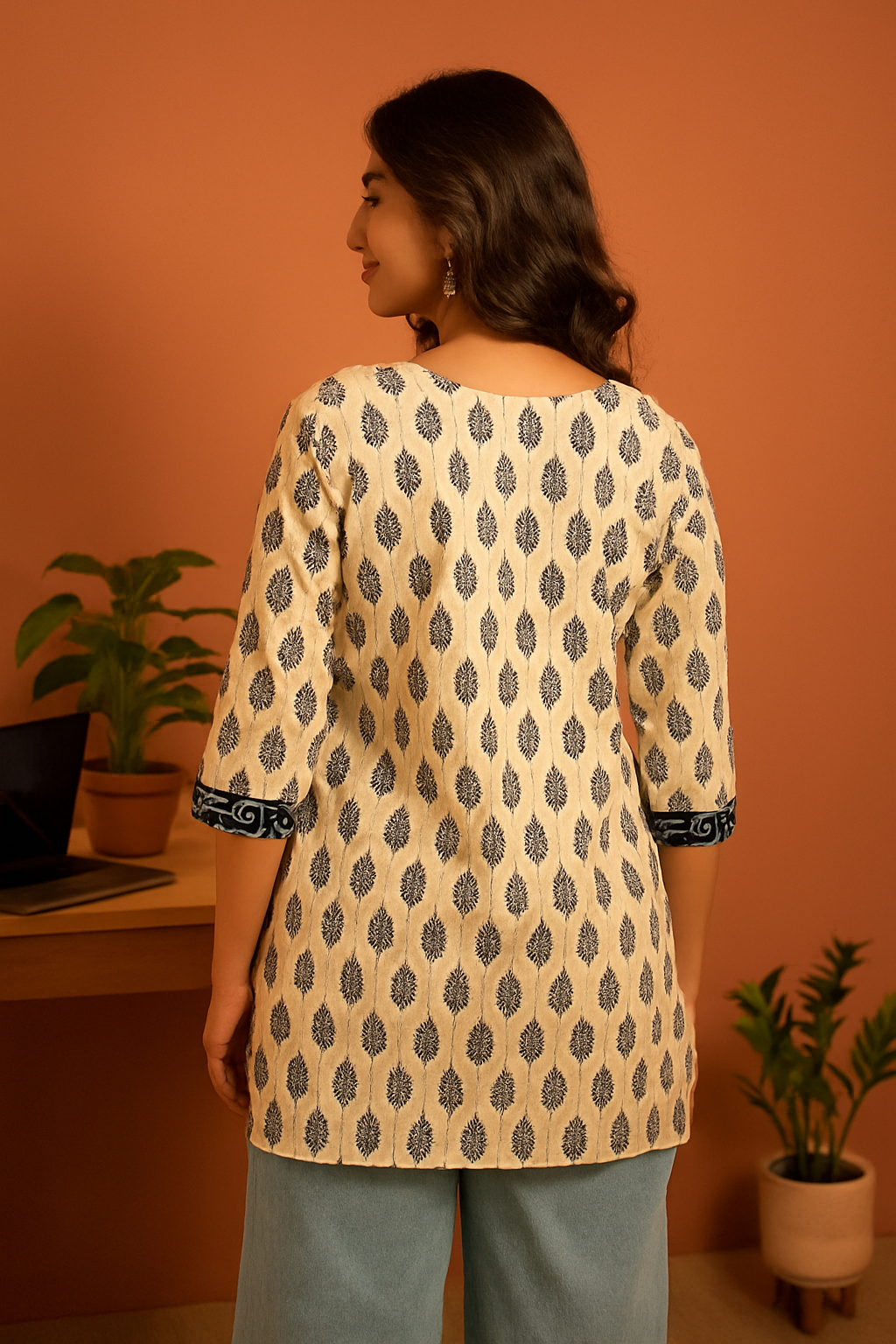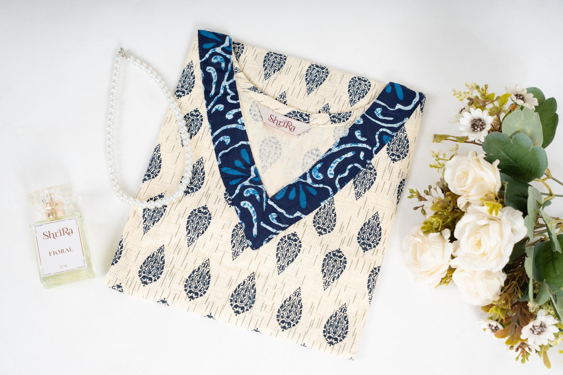Grace meets comfort in Ivory Indigo Bloom — a soothing beige kurti adorned with delicate blue leaf motifs and a bold indigo neckline. A perfect pick for everyday elegance and effortless style.
